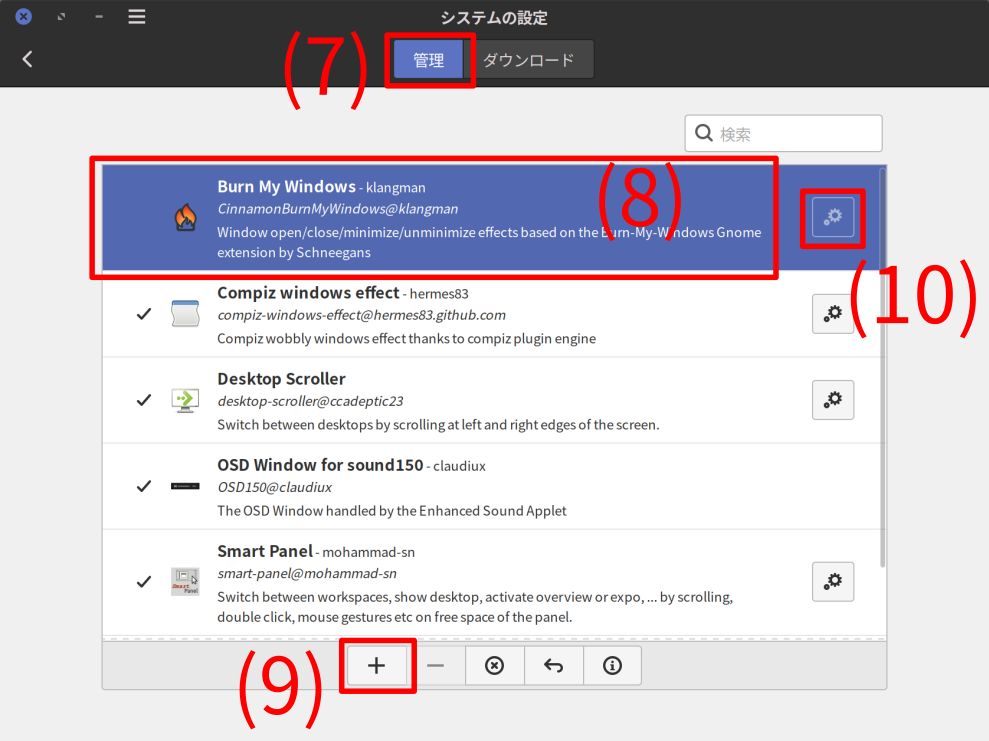 - さらに “システム設定” の “拡張機能” から “ Compiz windows effect” や “ Burn My Windows” をインストールすることで、より動的なウィンドウアニメーションを楽しむことができる。