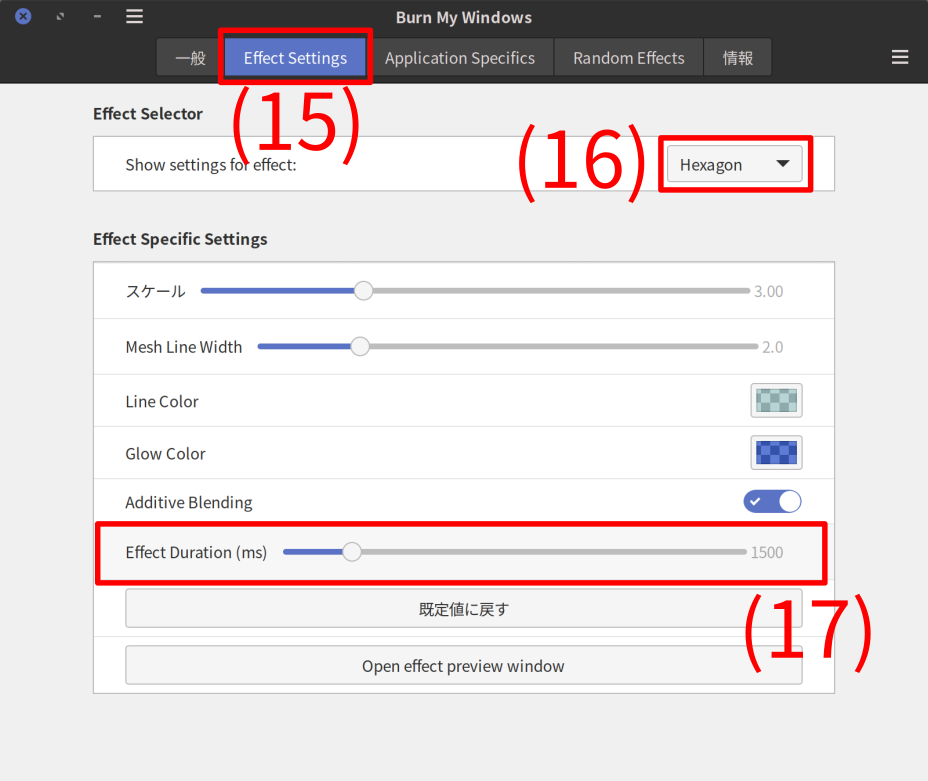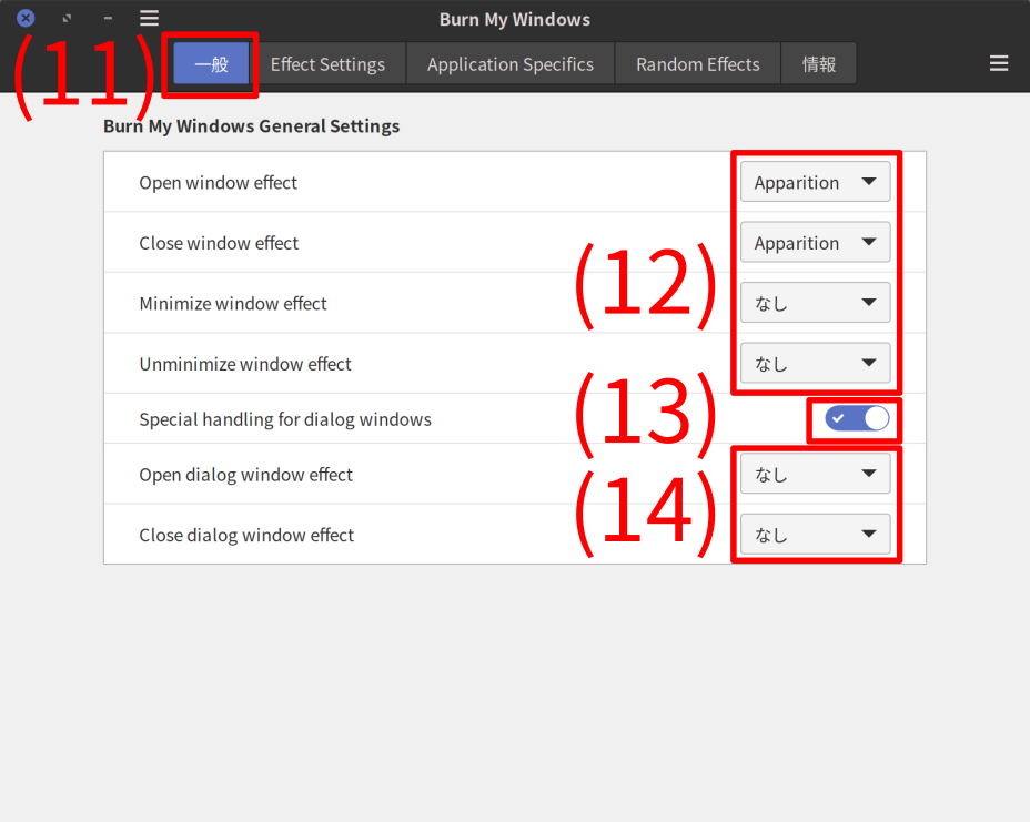 - “Open window effect” (ウィンドウ開始時)、“Close window effect” (ウィンドウ終了時)、“Minimize window effect” (ウィンドウ最小化)、“Unminimize window effect” (ウィンドウ最小化解除) のウィンドウアニメーションを設定する。